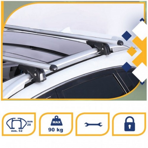 Μπάρες οροφής LION1 της K39, ιταλικής προέλευσης, κατασκευασμένες από ανακυκλώσιμο αλουμίνιο, υλικό φιλικό προς το περιβάλλον, εξοπλισμένη με ενσωματωμένες κλειδαριές και υποδοχή T-track, η οποία είναι προστατευμένη με ελαστικό αντιολισθητικό κάλυμμα κατά μήκος της, κατάλληλες για οχήματα που διαθέτουν Standard Rails - εργοστασιακές παράλληλες μπάρες κατά μήκος, οι οποίες δεν εφάπτονται στην οροφή του αυτοκινήτου (με κενό).