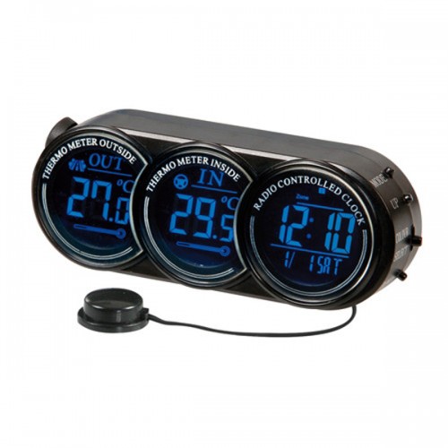 Ράδιο-ελεγχόμενο ψηφιακό ρολόι (RCC) και in / out θερμόμετρο. Οι μπαταρίες συμπεριλαμβάνονται. 2 χρώματα (λευκό / μπλε) οπίσθιου φωτισμού με πρίζα για αναπτήρα 12/24V. Ρυθμιζόμενη μεταλλική βάση. Ταινία διπλής όψης.