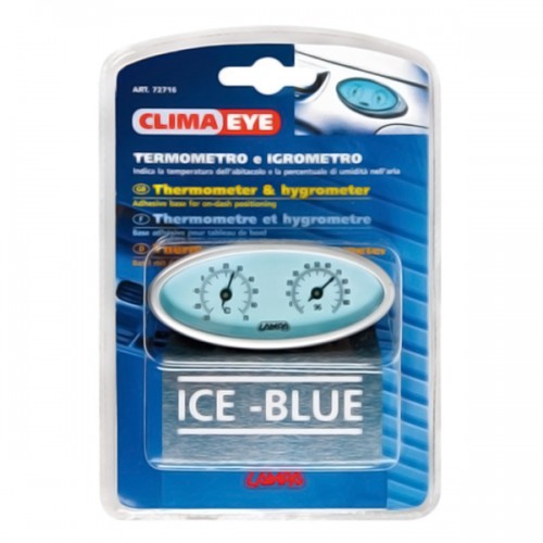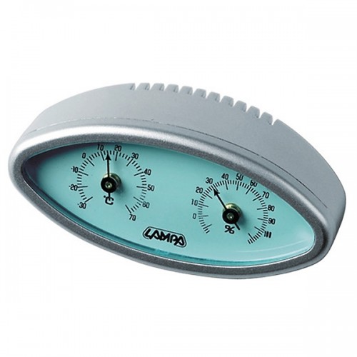 Θερμόμετρο/υγρόμετρο,χρώμααλουμινίου,μπλε φόντο, κόλλα βάσης.