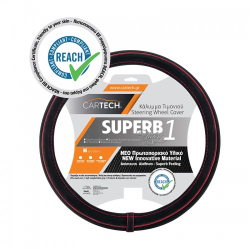 Κάλυμμα τιμονιού από την ΝΕΑ σειρά Superb. Το νέο πρωτοποριακό υλικό προσφέρει απίστευτη αίσθηση στην οδήγηση. Πιστοποιημένο βάση προδιαγραφών REACH που εξασφαλίζει υψηλό επίπεδο προστασίας της υγείας του ανθρώπου και του περιβάλλοντος.